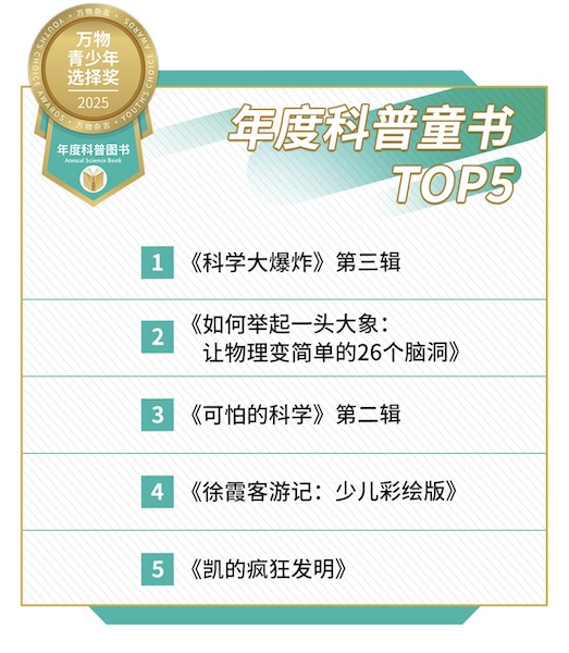 而在“年度科普童书”榜上,孩子们的阅读版图空前开阔。从硬核的《科学大爆炸》到人文气息的《徐霞客游记:少儿彩绘版》,上榜图书跨越不同学科和知识IP。与其他书单不同,在万物“青少年选择奖”的评选过程中,孩子们第一次真正摆脱了成年人的视角,纯粹按照自己的兴趣,投选出心目中最想看的年度好书。