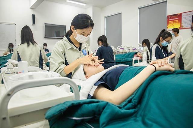 5月31日,浙江省温州市第二职业中等专业学校,形象设计专业的学生在参加学校举办的校技能节的美容护理比赛。黄可莹 摄