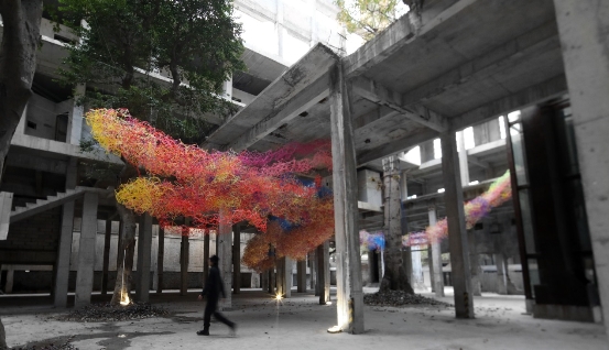 在特定的场馆空间,装置作品在空间上与建筑的属性产生对话,创造了具备冲击力的设计语言。根据建筑空间的条件,一条40米的长龙贯穿建筑的空间,通过色彩、形体与环境的塑造制造一种矛盾,其反映中国商业发展环境与环保生态周遭的集中矛盾。这个矛盾建立在美的诱惑与现实的反思之间,通过将一种非自然的美感与现实联系,创作者尝试把握城市发展的矛盾去成立一个警惕性。