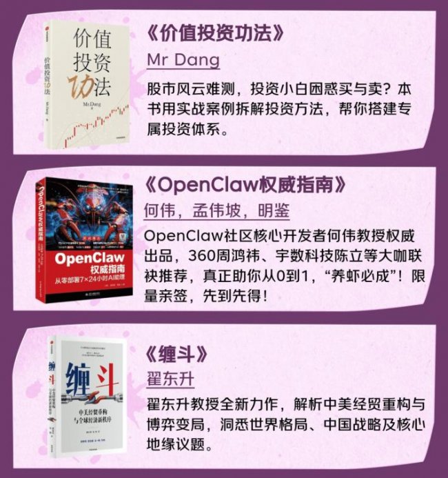 知识快速迭代的当下,想要实现认知进阶与能力升级,本月这三本新书值得重点关注。《价值投资功法》由职业投资者Mr Dang执笔,针对投资小白“买与卖”的普遍困惑,用真实案例拆解投资方法,帮助读者搭建专属投资体系,在股市风云中稳步前行。《OpenClaw权威指南》由OpenClaw社区核心开发者何伟教授权威出品,获得360周鸿祎、宇树科技陈立等行业大咖联袂推荐,内容兼顾理论深度与实操指引,从部署到应用,助力读者从0到1学会“养虾”,作者限量亲签版同步上线。翟东升教授全新力作《缠斗》,聚焦中美经贸重构与全球博弈变局,以清晰的逻辑、通俗的语言深入解析世界格局演变、中国战略选择及核心地缘议题,为读者提供理解当下国际形势的清晰框架。
